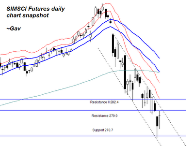 Short order is set at 275.1 level and it was triggered. Lower highs are observed with flat HangSeng. I discounted chances of strong rebound today. Market sentiment shows a flat with negative biased. Intrady Nikkei futures shows a downtrend is being formed as well.