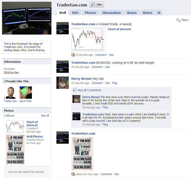 Just a little experiment. I have created a Facebook Fan page for TraderGav.com. I thought it is a good venue to post some real time trading thoughts, interesting links, thoughts etc. Check it out if you are interested in joining the conversation. You can also find the Like box at the side bar of this […]