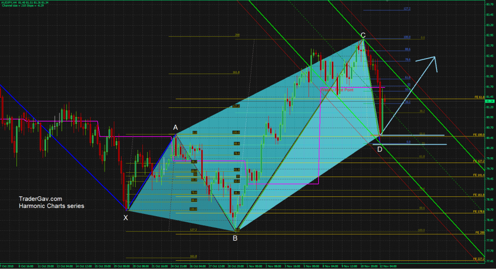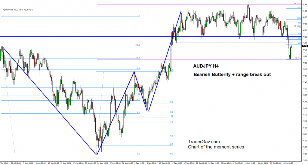 I was watching AUDJPY. I thought it was going to invalidate the Bearish Butterfly formation. We had just broken out from the trading range yesterday, and now it renews my interest in shorting the pair. I am watching closely and preparing to build a swing short position. what do you see here? Here is the…CHART!