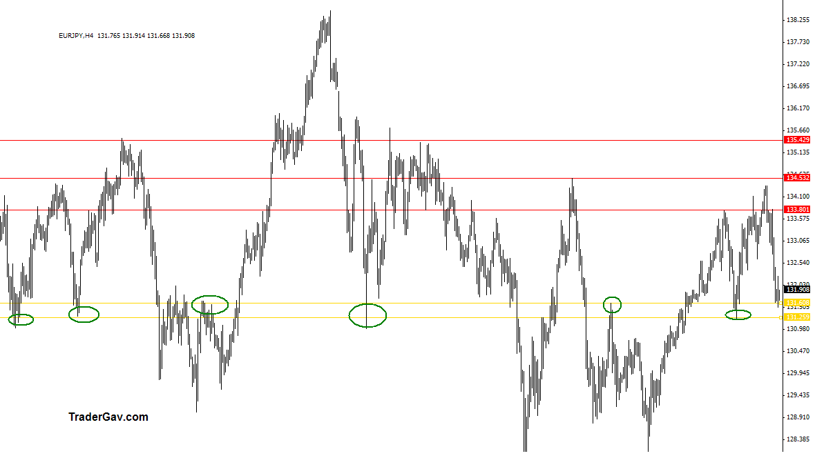 We had a nice sell off at the resistance level. Now, things are getting more interesting. EURJPY has fallen back to previous support area. Let’s see if we can catch some bounces here. What do you think? Here is the 4-hr chart.